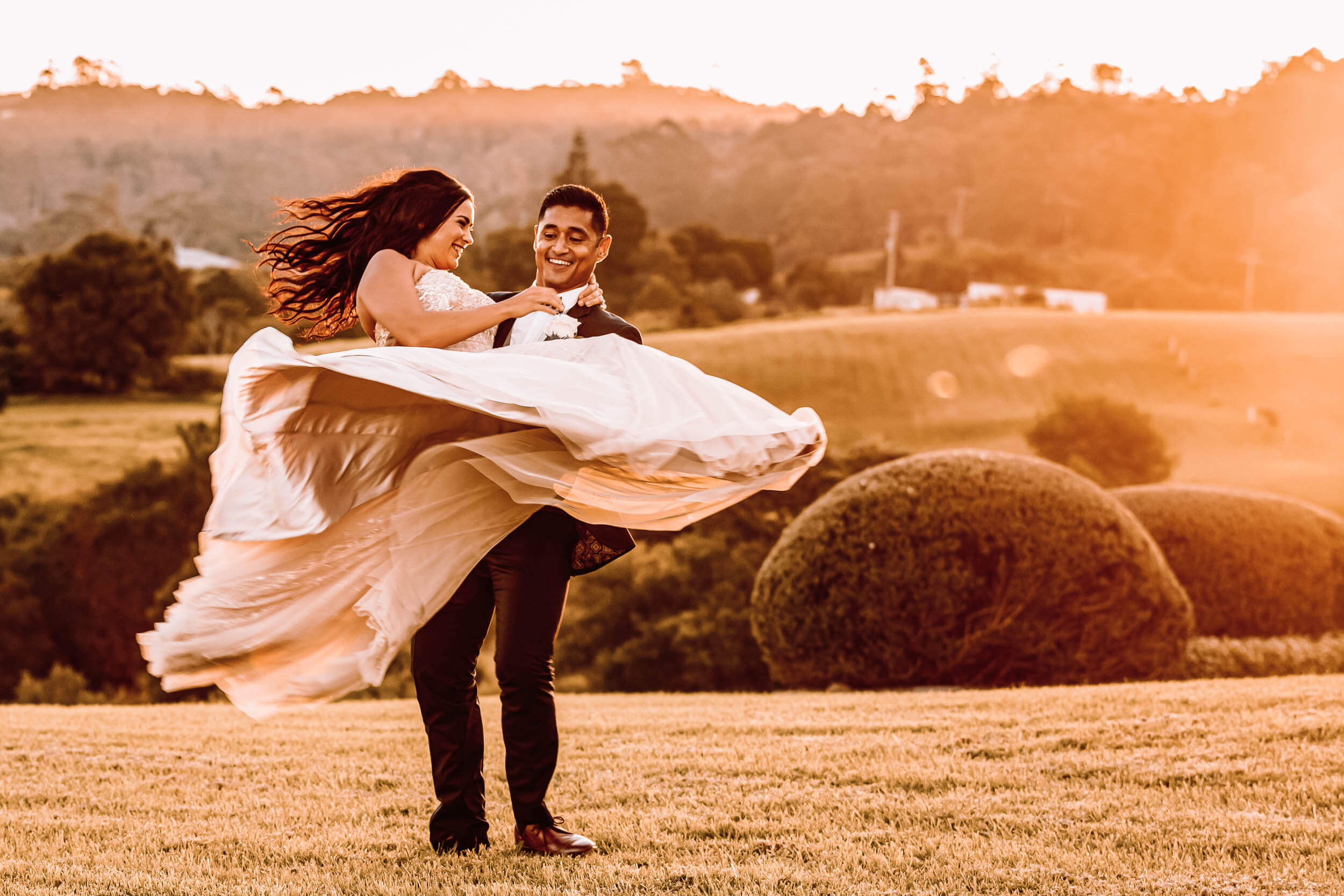 I generally use this the portrait session of the wedding day. If the groom can pick up the bride, great: if not, use the side-by-side variations. Have your camera on a fast shutter speed, and set the focus mode to servo. Keep your focal point on their heads. Use f3.5 or f4.0 to give you a better chance of making focus, or shoot with a long focal length (e.g. 200mm) if you need the f stop lower (e.g. f1.8) to suit the light.