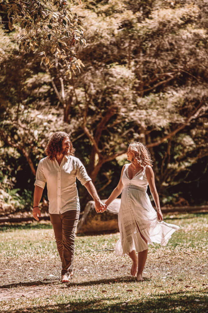 Keep specific posing instructions to a minimum: too many posed photos will leave your couple stiff and awkward. It will give them the sense they have to wait for you to “pose” them before you take the photo, or like they have a dozen things to remember. Bring flattering angle tips into play subtly by moving yourself. Prevent self-conscious reactions (stiffness and awkwardness!) by saying, “Just going to shift over here for a better angle with this light,” or simply say nothing at all.